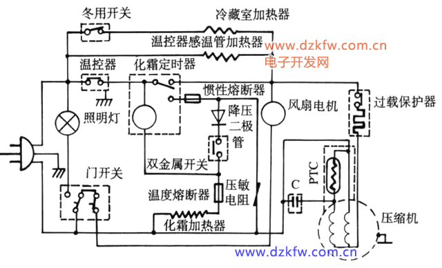 壓縮機控制電路是指從電源插頭→溫控器→化霜定時器→過載保護器→壓縮機→PTC啟動繼電器及電容器和電源插頭的一條回路。