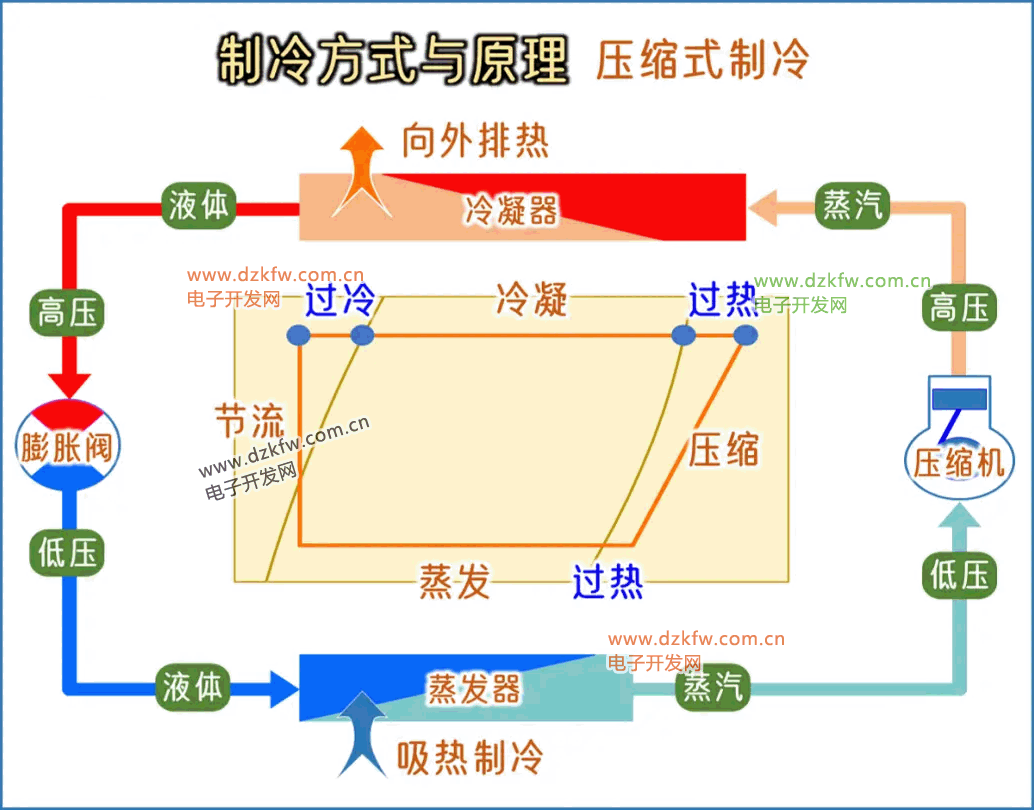 蒸汽壓縮式制冷是當前應用最廣泛的一種制冷方式,它利用制冷劑在蒸發(fā)器內(nèi)吸熱蒸發(fā)、在冷凝器內(nèi)放熱冷凝的相變過程進行制冷。