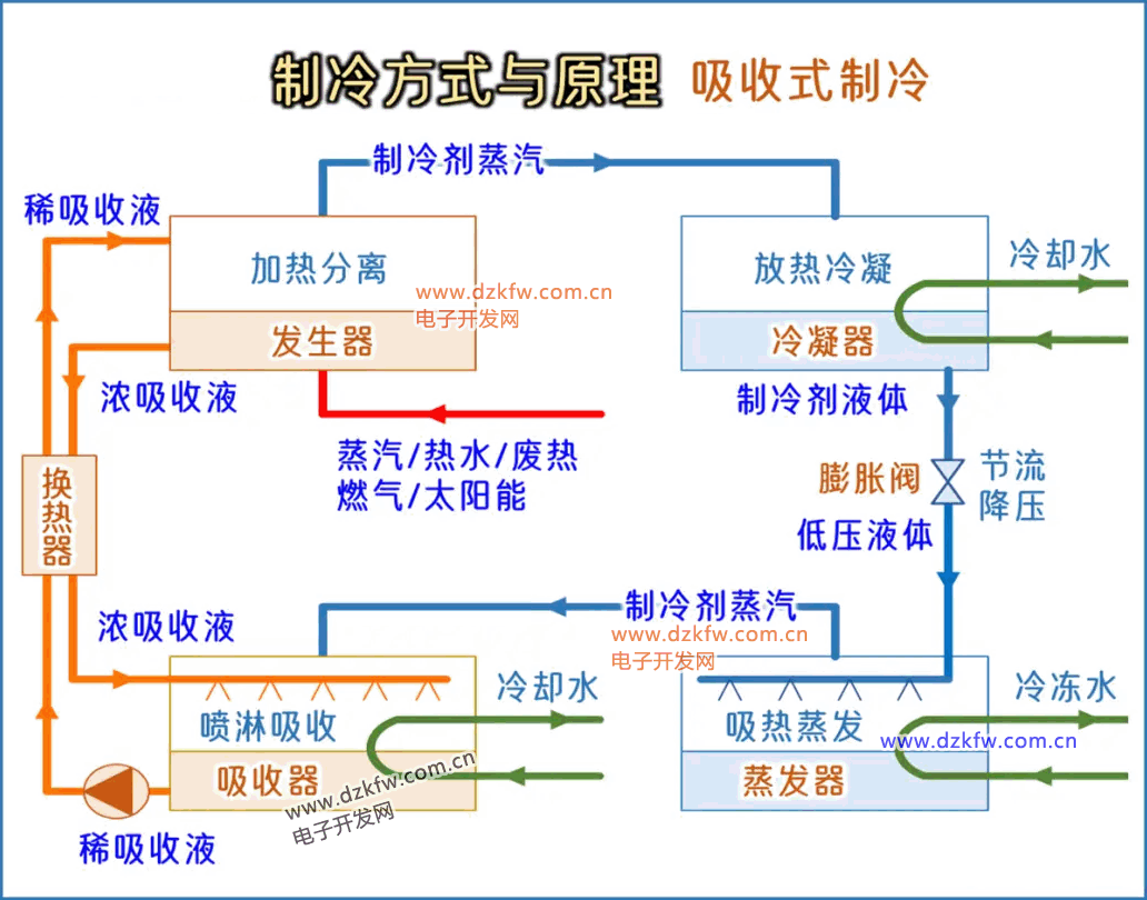 吸收式制冷的優(yōu)點是以熱能為動力,能充分利用工業(yè)余熱、太陽能、地熱等低品位熱源,運行成本低,還無需壓縮機,噪音小、維護簡單。