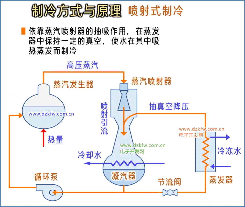 蒸汽噴射式制冷,依靠蒸汽噴射器的抽吸作用,在蒸發(fā)器中保持一定的真空,使水在其中蒸發(fā)而制冷。