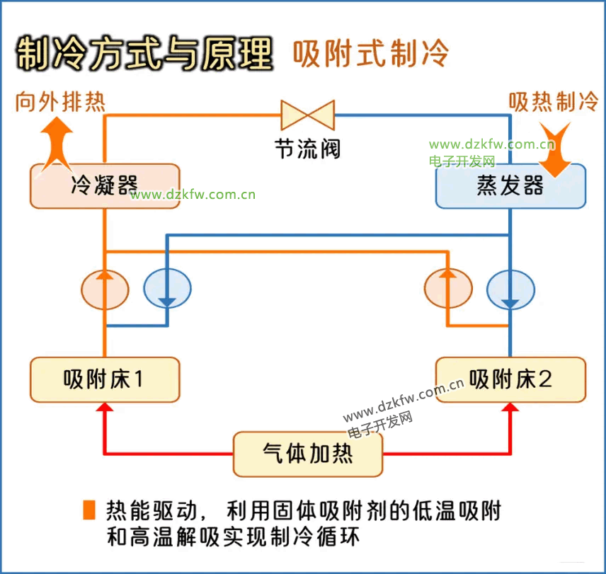 吸附劑吸附制冷劑蒸氣時,蒸發(fā)器內(nèi)液態(tài)制冷劑蒸發(fā)吸熱(對外部制冷)。吸附劑再生加熱,脫附的制冷劑蒸氣到冷凝器內(nèi)冷凝放熱,完成一個制冷循環(huán)。