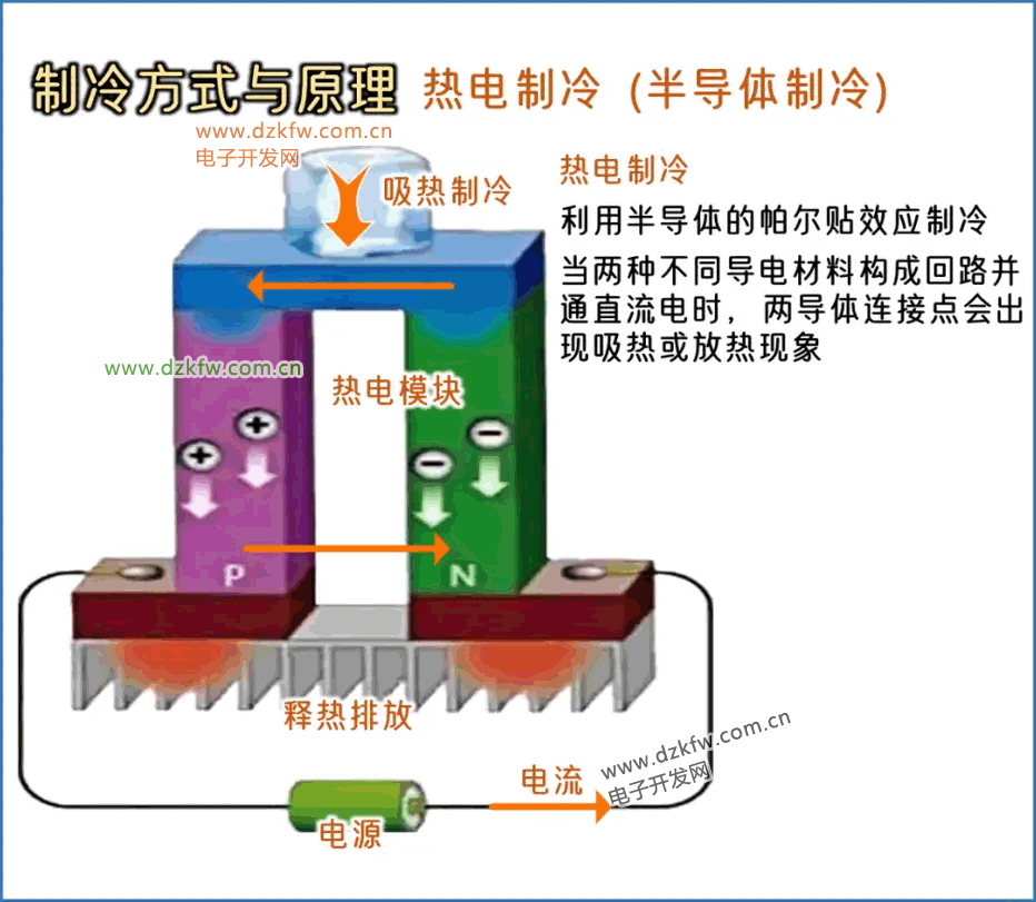 熱電制冷的優(yōu)點是,體積小、重量輕、無噪音、無需制冷劑、啟動快、溫度調(diào)節(jié)精準,能實現(xiàn)- 20 ~ 70℃的溫度范圍。缺點是能效系數(shù)低(一般<1.0),制冷量小,單臺設備制冷量通常在幾百瓦以下,成本還高。