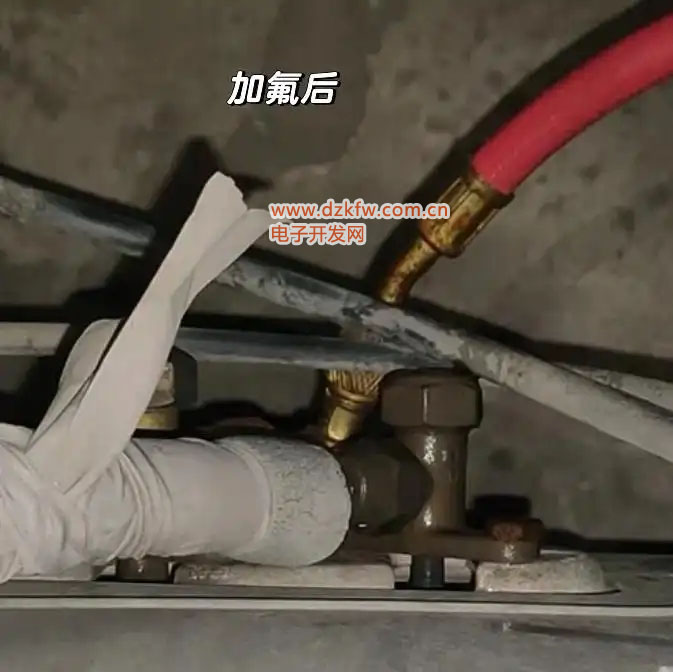 如果我們發現空調室外機的外露高壓管的細管結霜,(此時要清楚,外機有一根粗管,一根細管,我們看的是細管)那么此時基本上判斷就是空調缺氟。