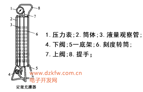 它是制冷系統充灌制冷劑并能準確控制加液量的專用器具,其外形結構如圖