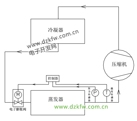 吸氣過熱度控制系統(tǒng)由電子膨脹閥、壓力傳感器、溫度傳感器、控制器組成,工作時,壓力傳感器將蒸發(fā)器出口壓力P1、溫度傳感器將壓縮機吸氣過熱度傳給控制器,控制器將信號處理后,隨后輸出指令作用于電子膨脹主閥的步進電機,將閥開到需要的位置。電子膨脹閥吸氣過熱度控制制冷系統(tǒng)原理圖如下圖所示: