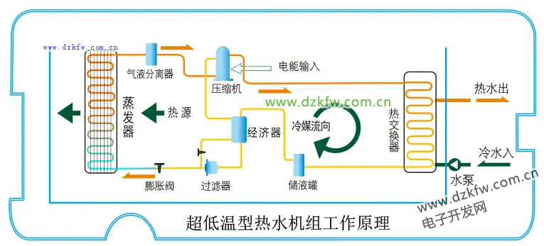 壓縮機把低壓氣態冷媒吸入,轉化成為高溫高壓的氣體,并推入冷凝器(即水箱換熱盤管),在節流閥的作用之下,高溫高壓的氣體在冷凝器中由氣態冷卻成液態,同時釋放大量能量。釋放的能量進入水箱中,把水加熱起來了。釋放掉能量并變成液態的冷媒經節流閥流入蒸發器(即空氣換熱器),壓力瞬間降低,液態的冷媒在低壓環境下又蒸發成氣態,此時吸收大量的熱量。吸收熱量變成氣態的低壓冷媒被吸入壓縮機,進入下一個循環。