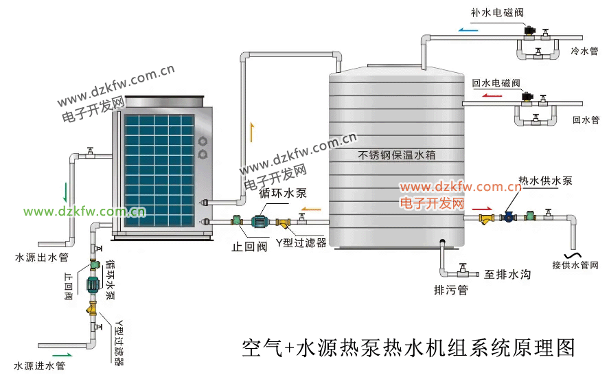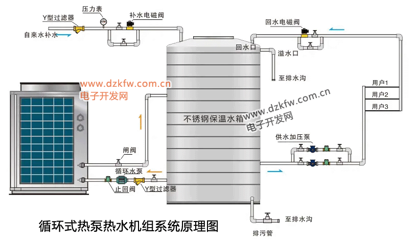 泳池、泡池、溫泉熱泵熱水機組系統原理圖