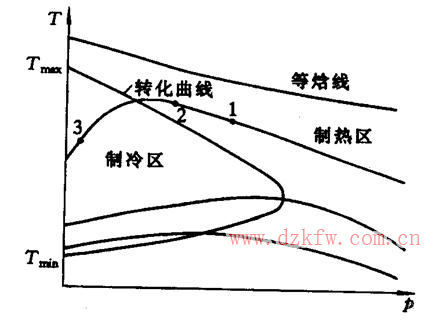轉化曲線把p-T平面分為兩個區:制熱區和制冷區。在制熱區內,微分節流效應為負值,在制冷區內為正值。對于積分節流效應的情況與微分節流效應有所區別。,這取決于節流開始的狀態和節流后的壓力。一般氣體的Tmax都高于環境溫度,如氮氣 (604K),因此在環境溫度下節流都有可能使之溫度降低。但氦氣 (46K)、氫氣 (204K)和氖氣 (205k),它們的Tmax遠低于環境溫度,因此,在環境溫度下節流是不能讓它們降溫的。若要使它們溫度降低必須采用預冷到Tmax之后再節流的辦法或用膨脹機膨脹的辦法或絕熱放氣的辦法。