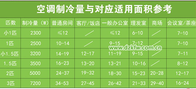1匹的制冷量大致為2000大卡,換算成國際單位應(yīng)乘以1.162,故1匹之制冷量應(yīng)力2000大卡x1.162=2324(W),這里的W(瓦)即表示制冷量,則1.5匹的應(yīng)為2000大卡x1.5x1.162=3486(W),以此類推。根據(jù)此情況,則大致能判定空調(diào)的匹數(shù)和制冷量,一般情況下,2200W—2600W都可稱為1匹,4500(W)— 5100(W)可稱為2匹,3200W—3600W可稱為1.5匹。