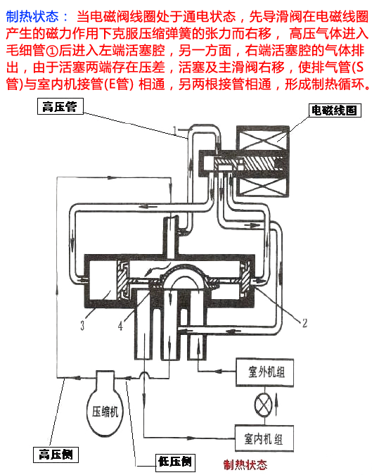 空調制熱狀態(tài): 當電磁閥線圈處于通電狀態(tài),先 導滑閥在電磁線圈產(chǎn)生的磁力作 用下克服壓縮彈簧的張力而右移, 高壓氣體進入毛細管①后進入左 端活塞腔,另一方面,右端活塞 腔的氣體排出,由于活塞兩端存 在壓差,活塞及主滑閥右移,使 排氣管(S管)與室內機接管(E管) 相通,另兩根接管相通,形成制 熱循環(huán)。