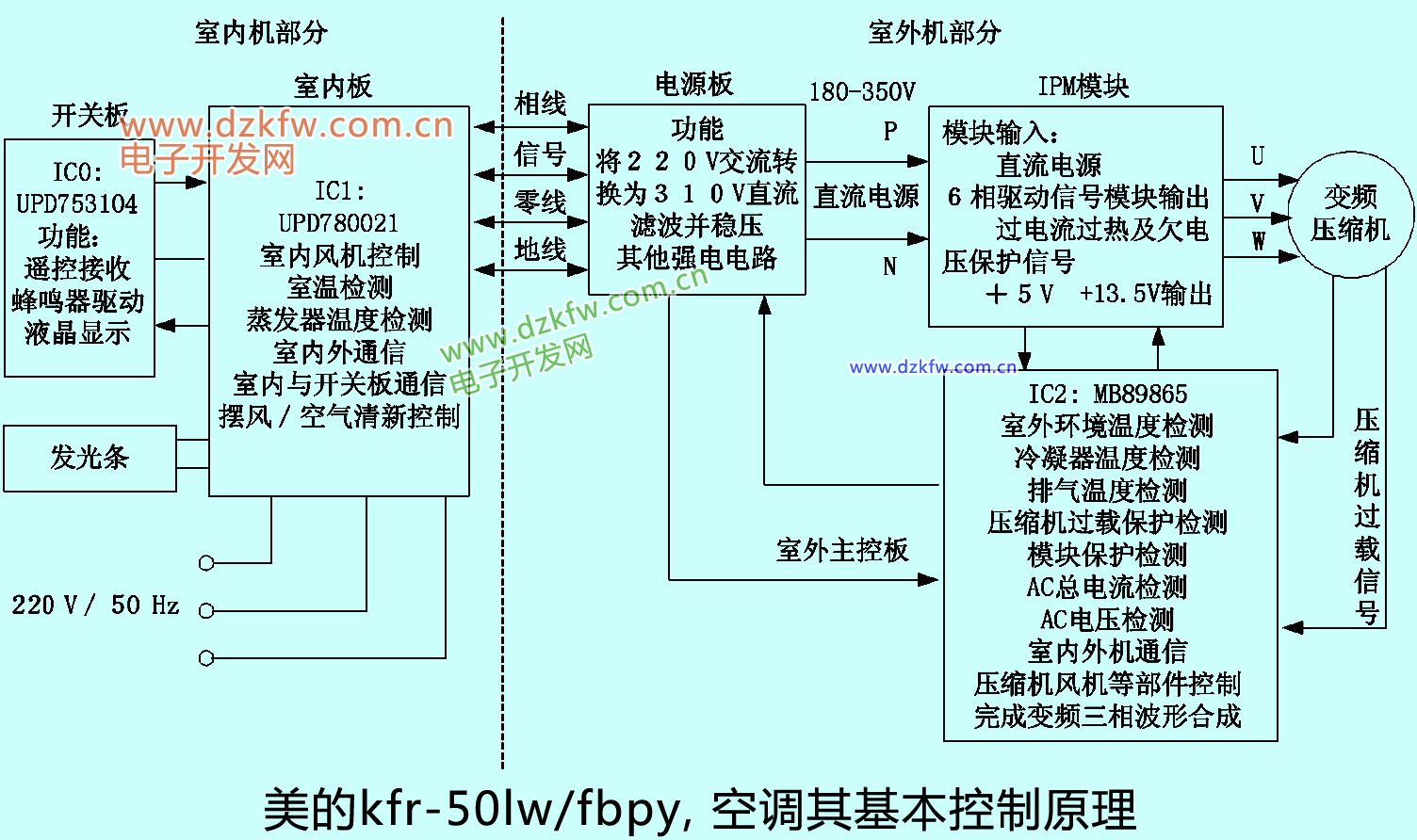 變頻空調器是當今房間空調器發展的方向,它通過變頻控制器調節壓縮機的轉速(頻率),實現了制冷(熱)量與房間熱(冷)負荷的自動匹配,具有調溫速度快,低溫制熱效率好,溫度控制精度高,適用溫度、電壓范圍寬等優點。特別是隨著變頻技術的發展,空調變頻從交流變頻轉到直流無刷電機、永磁同步電機變頻,因此變頻空調器無論是從使用電力電子器件,還是控制策略都廣泛地使用了當代的先進技術。無論是國產還是進口變頻空調,其控制電路原理大體相同,一般由室內機和室外機控制電路構成,下面以美的kfr-50lw/fbpy為例說明其基本控制原理。